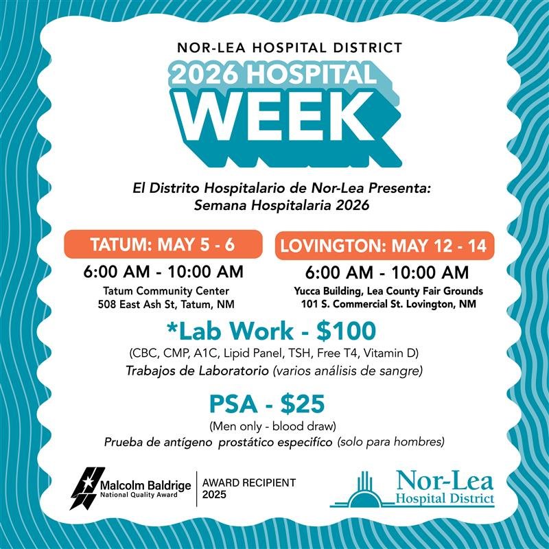 We invite you to join us in early May for our Hospital Week 2026, annual community wellness testing! Grab a loved one and take advantage of affordable wellness testing that includes lab work and PSA’s for men. We are proud to return this great opportunity to Lea County!